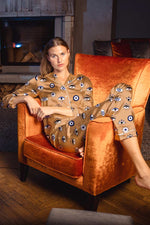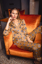 Amara has the dreamy meaning of 'everlasting'. The hand-drawn evil eyes in a medley of shapes and sizes are are scattered across a bold, shiny bronze-gold. One thing's for sure, no one can take their eyes off this collection.