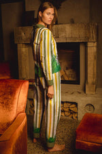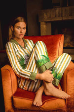 Our Uma Pajama set with its classic pinstripes and adventurous jungle print is an homage to the awakening African nature. Uma meaning tranquillity, mirrors the light breaking through the dense growth of the rainforest with it’s soft green and orange pastel tones. This collection is designed for both men & women with pieces created for both.