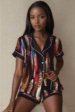 Our distinctive Novah collection is unique thanks to its collation of bright colors and animal prints, showcased alongside an elegant, sleek black overlay. Our designer created a layered, textured print, coated over with black, and then brushed away portions of the print to create this fantastic peek-a-boo effect. The cumulative look is definitely elegant and sleek with a touch of wild child.