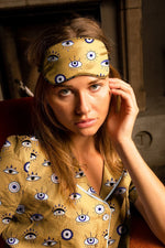 Amara has the dreamy meaning of 'everlasting'. The hand-drawn evil eyes in a medley of shapes and sizes are are scattered across a bold, shiny bronze-gold. One thing's for sure, no one can take their eyes off this collection.