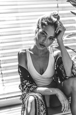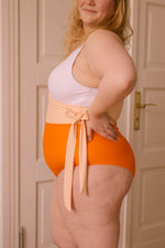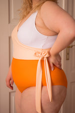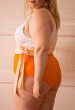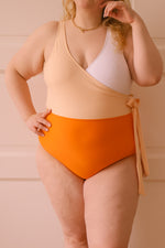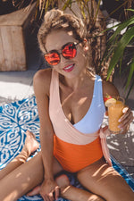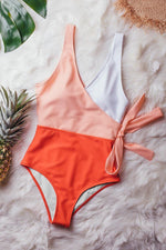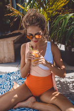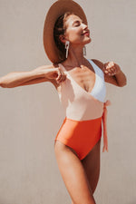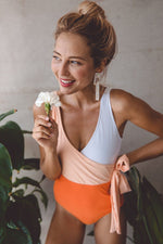 The one set to make a statement. This swimsuit’s tri-colour block in orange takes its inspiration from the ocean’s colourful fish and coral. The one-piece bathing suit has a medium plunging front and back, tied with a cute bowknot at the waist, which flatters and accentuates the waistline.